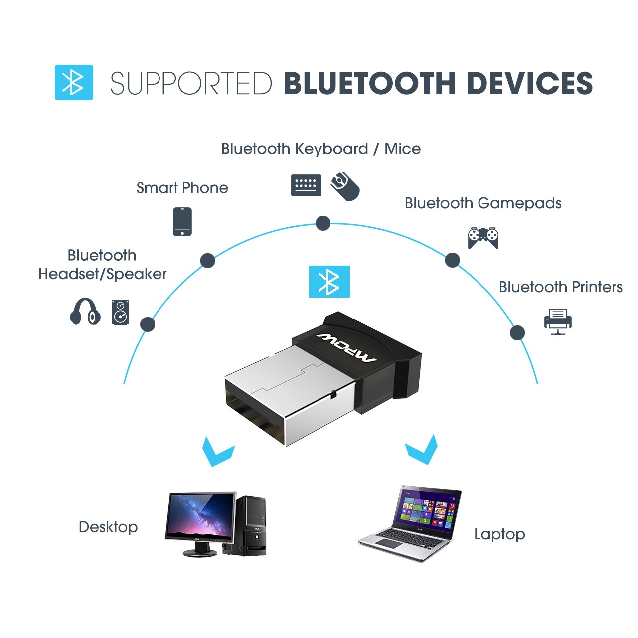 - DUAL MODES TRANSMISSION: Mpow Bluetooth USB Adapter supports transmit data and audio files. If your pc or laptop does not have Bluetooth function, Mpow Bluetooth usb dongle can endow your PC with Bluetooth function, you can easily connect a Bluetooth-enabled device such as Bluetooth speaker, Bluetooth headphone, Bluetooth printer, Bluetooth mouse, Bluetooth keyboard, smartphone to your computer. Extremely compact Bluetooth usb adapter.